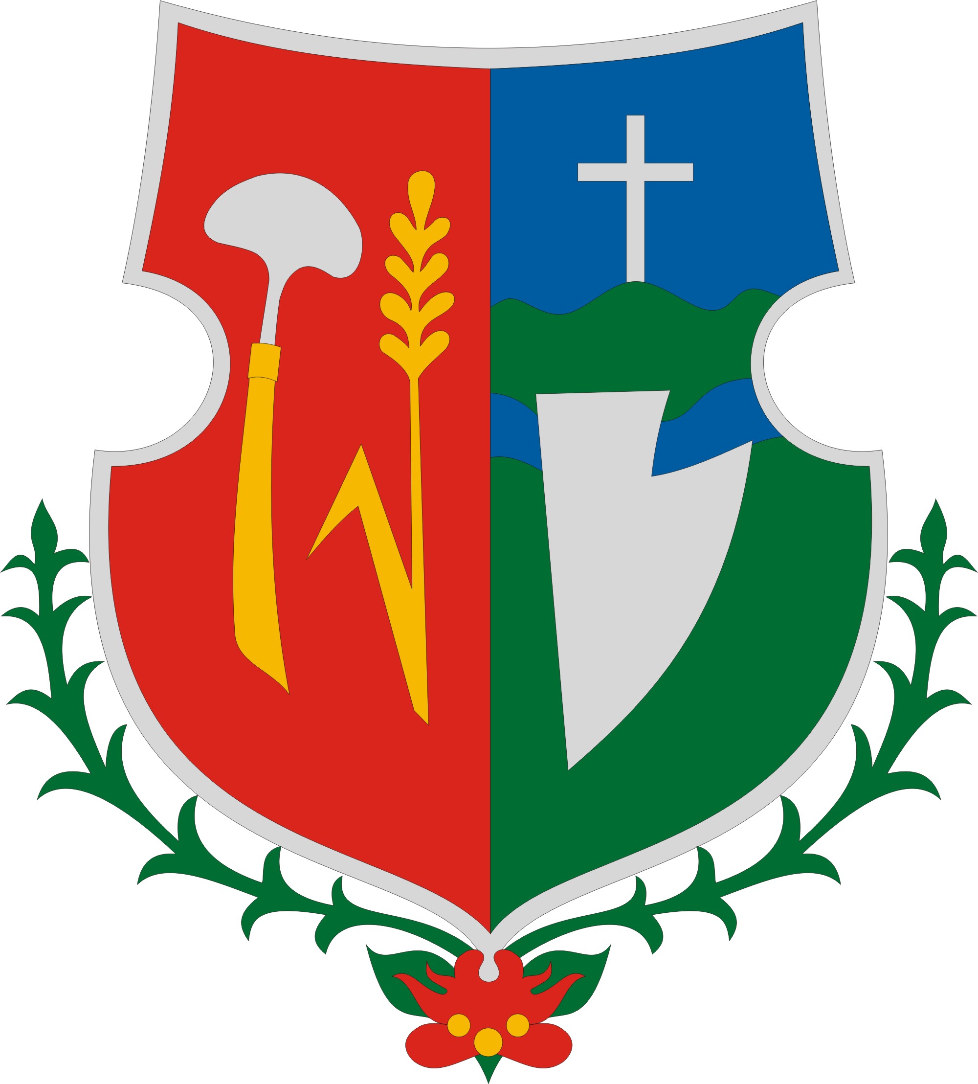 A bal oldalon elhelyezkedő isztike a búzatáblák gyomtalanítását, a búzakalász a munka eredményét, az "életet" jelképezi. A címerpajzsot alulról félkörívben rozmaring virágmotívum övezi, mely a népi hagyományok, a pingáló művészet kifejezésére szolgál. A címerpajzsban használatos élénk kék, zöld és piros színek a népi színezésben használt alapszínek követései.