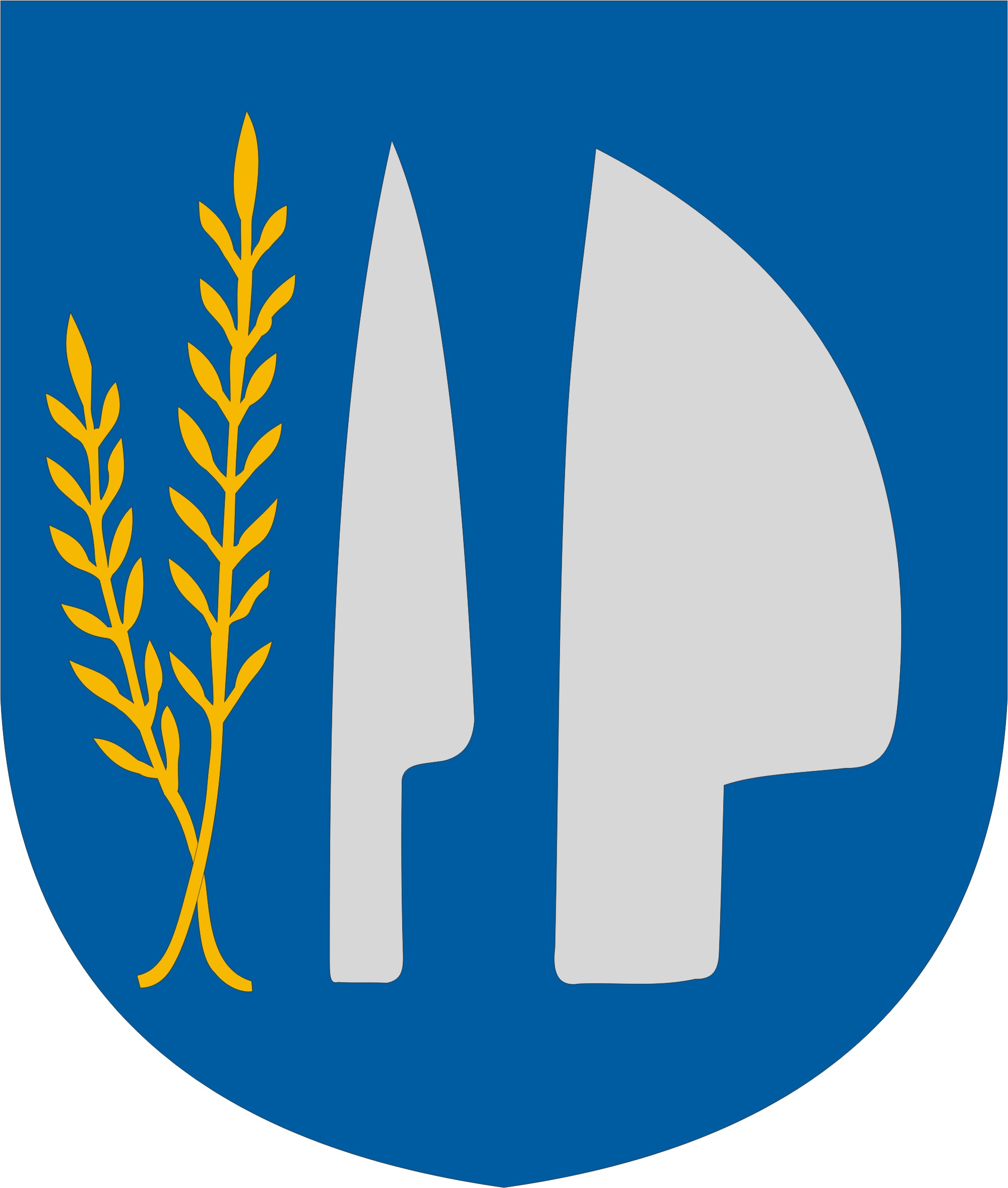 Egyenes állású, kerektalpú, kék pajzsban a középtől kissé jobbra, hegyével felfelé, élével balra fordított lebegő ezüst csoroszlya, a csoroszlyától jobbra két egymást szárával keresztező lebegő arany búzakalász, a csoroszlyától balra hegyével felfelé, élével balra fordított ezüst ekevas lebeg.