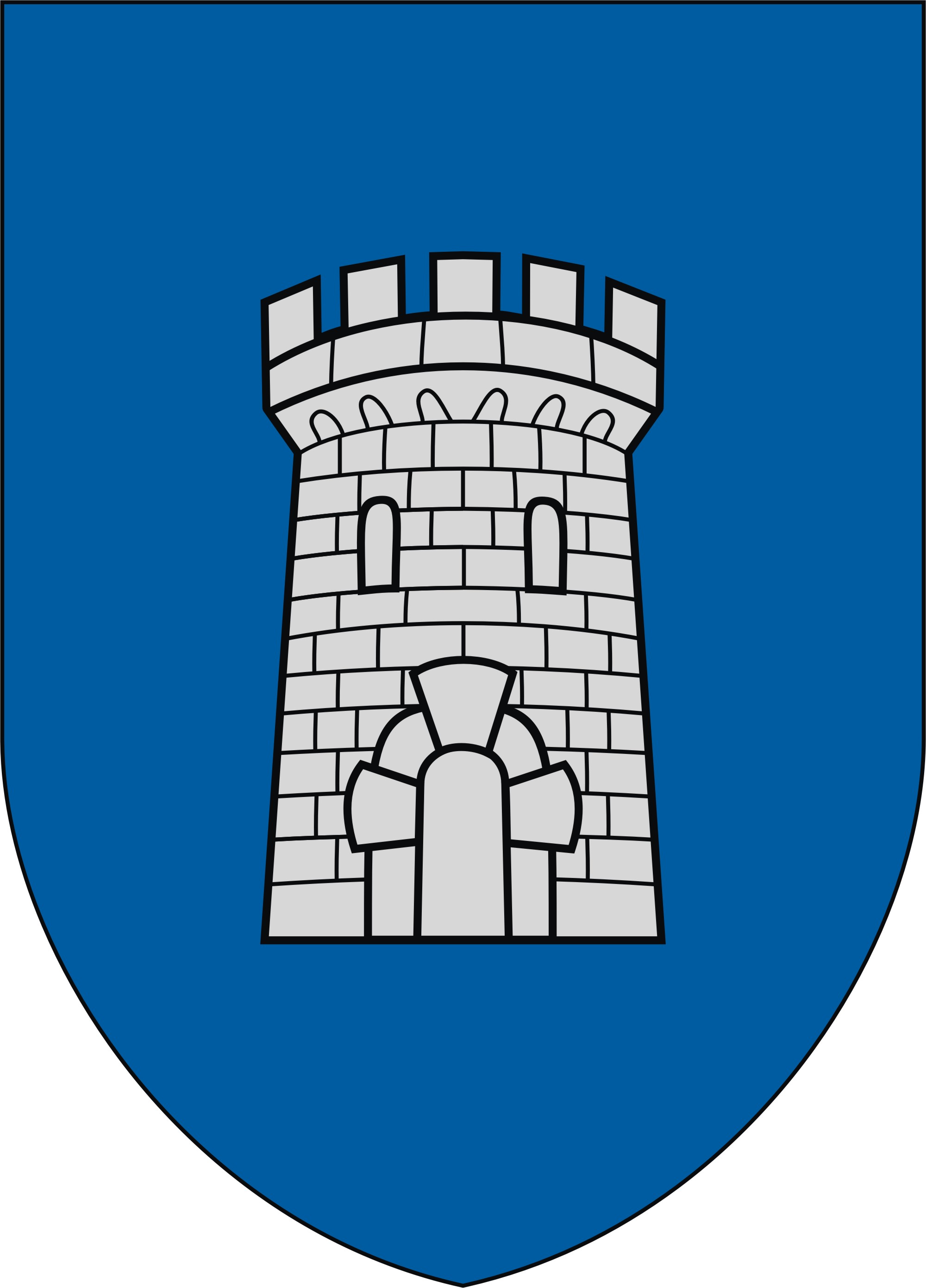 Kék színű, hegyes végű a pajzs, közepében kőkeretes nyitott kapuval ellátott, kétlőréses, ötormójú ezüstbástya lebeg.