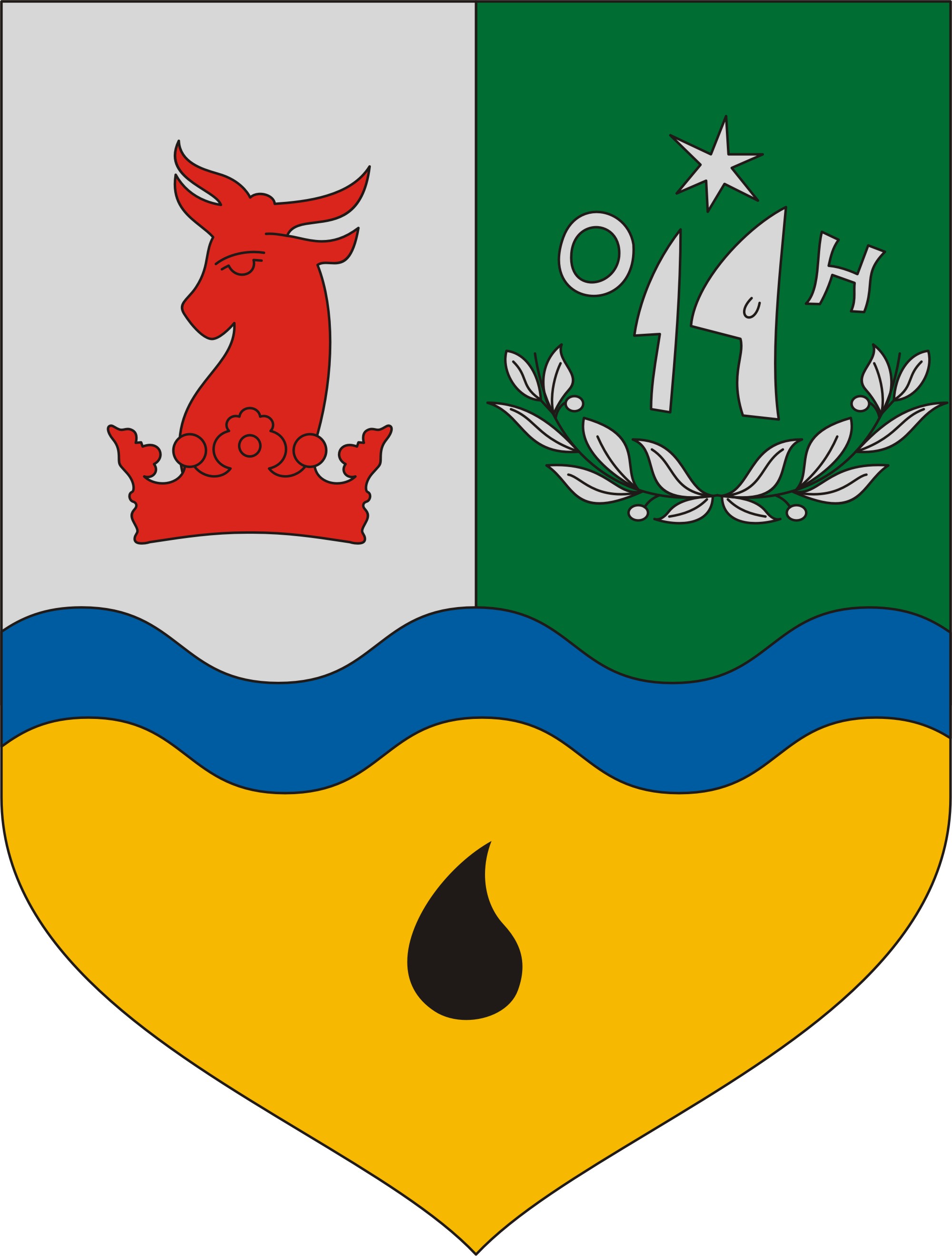 A jobb oldali, ezüst alapmázú felső mezejében koronából kinyúló, nyakkal ábrázolt, vörössel színezett ökörfej, a bal oldali, zöld alapmázú mezőben az Ortaháza régi pecsétjéből származó motívumok: ezüsttel színezett csoposzlya és ekevas, mellette két oldalt az 'O' és 'H' betűk, felette hatágú csillag, alatta babérág. A pajzsderék alján a két hullámos vágóvonal által határolt mezőrész kékkel színezett. Az aranymázú pajzstalp közepén fekete olajcsepp.