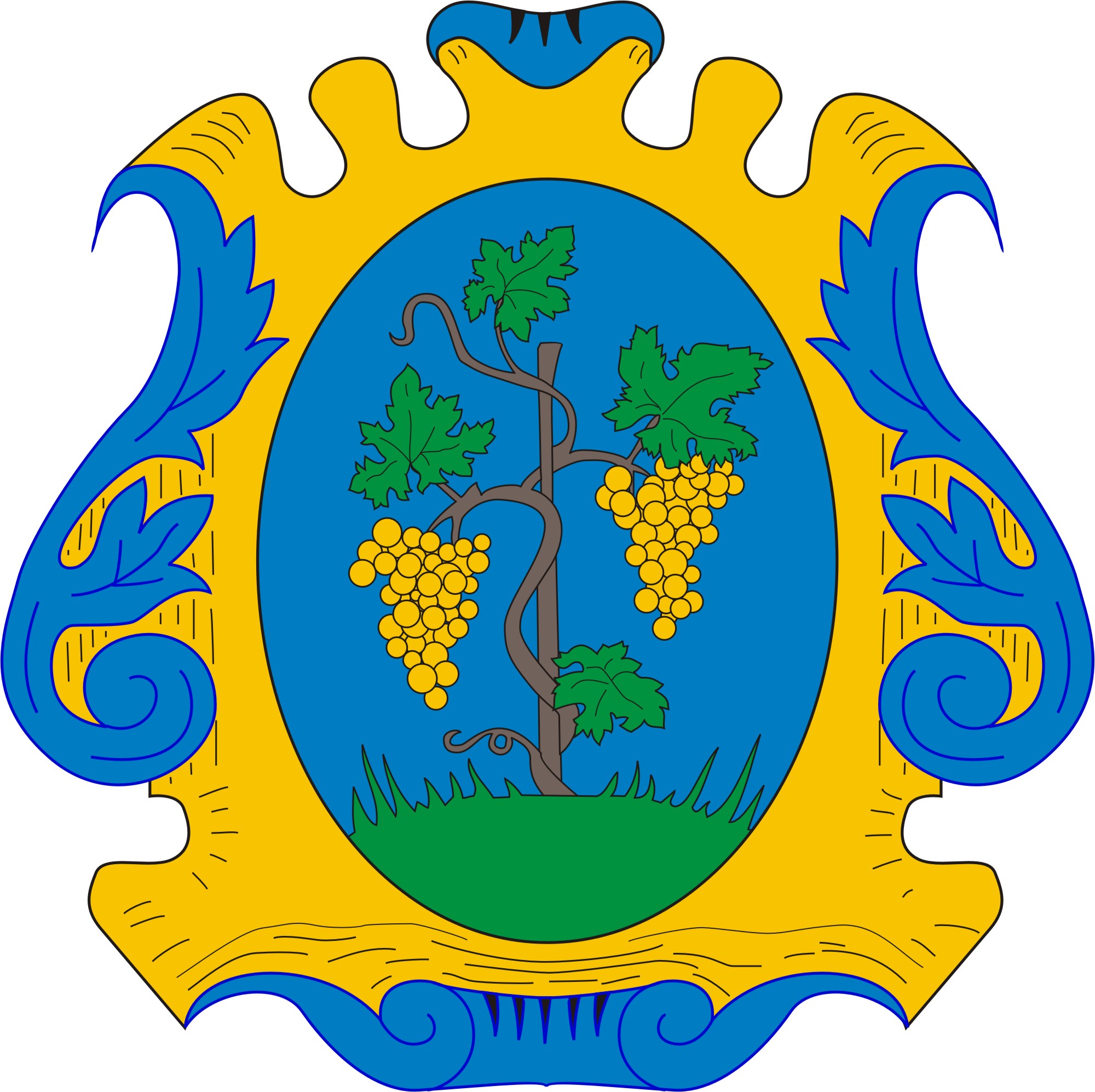 A címer állított, ovális címerpajzs, közepén kék mezőben zöld talajon természethű, szőlőkaró köré tekeredő szőlőtőkén balról és jobbról egy-egy arany (sárga) szőlőfürt, valamint két-két szőlőlevél.